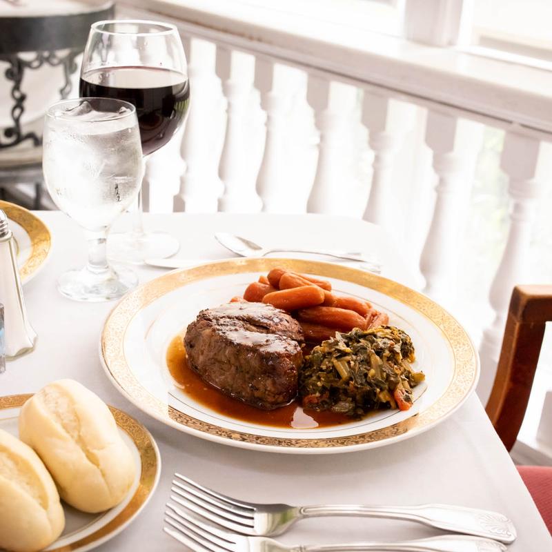 Had an early dinner. The service was fantastic and the atmosphere is rich old southern, very nice. The food was amazing. We started with fried green tomatoes, large portion, cooked great and tasted wonderful. My wife had salmon and she said it was very good. I had assorted veggies. The potato was cooked just right and the zucchini was grilled perfect. We both had garden salads, hers had raspberry dressing, mine balsamic vinaigrette. The salads were tasty and good sized. Best part of the dinner was the service, very attentive and polite staff.