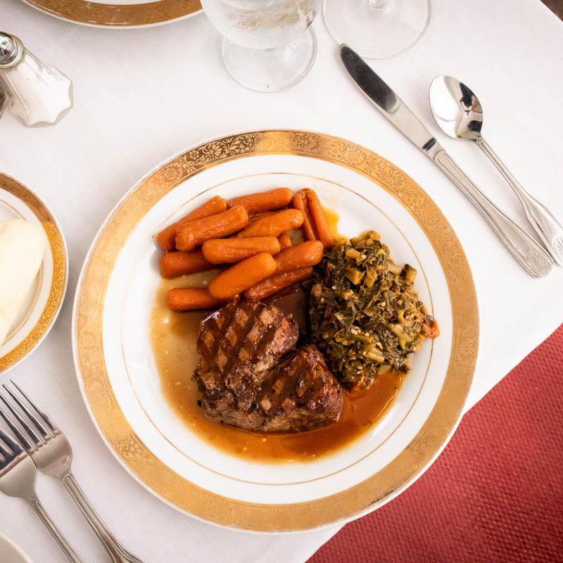Had an early dinner. The service was fantastic and the atmosphere is rich old southern, very nice. The food was amazing. We started with fried green tomatoes, large portion, cooked great and tasted wonderful. My wife had salmon and she said it was very good. I had assorted veggies. The potato was cooked just right and the zucchini was grilled perfect. We both had garden salads, hers had raspberry dressing, mine balsamic vinaigrette. The salads were tasty and good sized. Best part of the dinner was the service, very attentive and polite staff.
